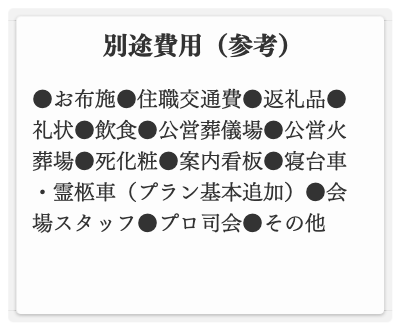 ●公営葬儀場●公営火葬場●宗教的費用●返礼品●会葬礼状●花祭壇のグレードアップ●会場スタッフの追加●プロ司会の追加●駐車場等警備員●飲食費●霊柩車のグレードアップ●棺・骨壺などの葬具のグレードアップ●その他