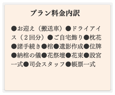 ●宗教的費用●返礼品●会葬礼状●自宅花祭壇のグレードアップ●会場スタッフの追加●駐車場等警備員●飲食費●霊柩車のグレードアップ●棺・骨壺などの葬具のグレードアップ●その他